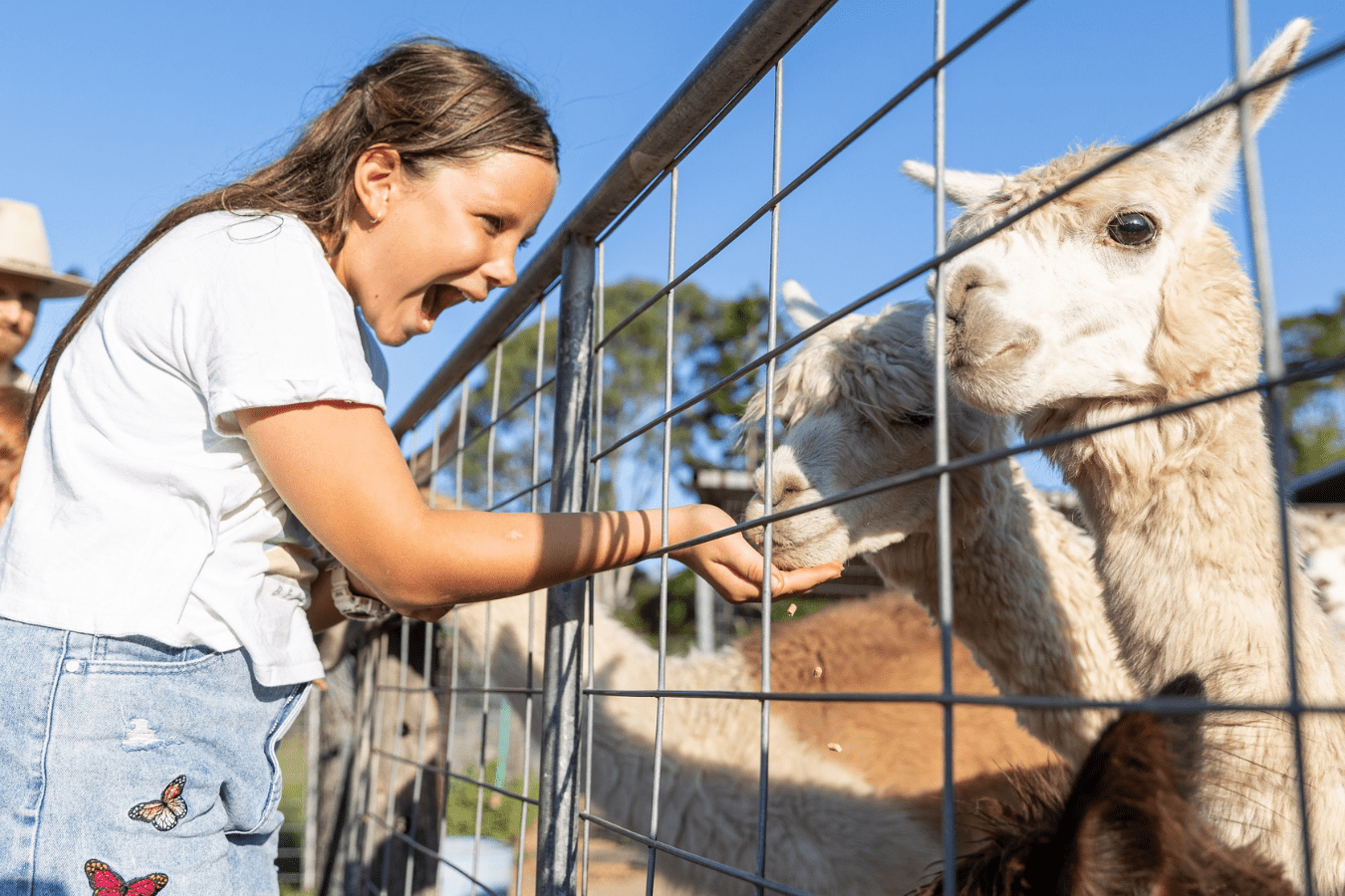 Soak up the fresh country air whilst enjoying activities like the adventure tree house, ride a horse, tractor ride and unique miniature train. Pet and feed guinea pigs, chickens and rabbits, lead Alpacas, horses and goats on extended farm walks. Join passionate tour guides on 1, 2, or 3-hour tours as they introduce their large range of friendly farmyard animals and share stories of their personalities and enjoy picnicking under the 140yr old Moreton Bay fig tree.